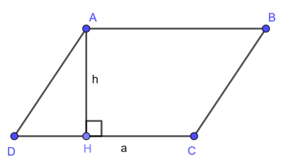 Cho hình bình hành ABCD, kẻ . Khi đó, AH là chiều cao của hình bình hành ứng với cạnh đáy CD. Diện tích hình bình hành ABCD là: